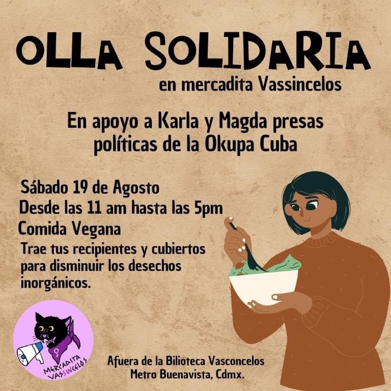 Te invitamos a la «Olla Solidaria» , estaremos ofreciendo alimentos por una cooperación solidaria y consciente en apoyo de las próximas actividades que enfrentan nuestras hermanas Karla y Magda activistas feministas quienes a 6 meses de su libertad condicional siguen el proceso tardío para obtener su libertad absoluta e inmediata.