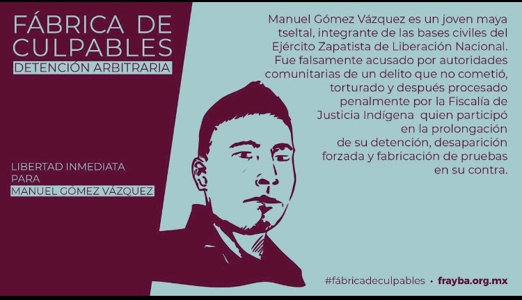Manuel Gómez Vázquez, es un joven maya tseltal Base de Apoyo del #EZLN que es criminalizado por ser zapatista; es falsamente acusado de un delito que no cometió, torturado y después procesado penalmente en complicidad de la Fiscalía de Justicia Indígena.