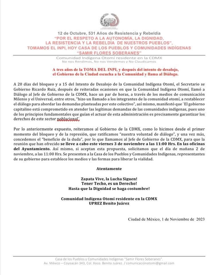 A 3 años de la toma del INPI, y después de un intento de desalojo, el Gob CDMX escucha a la Comunidad y llama al diálogo . Nov 1, 2013
