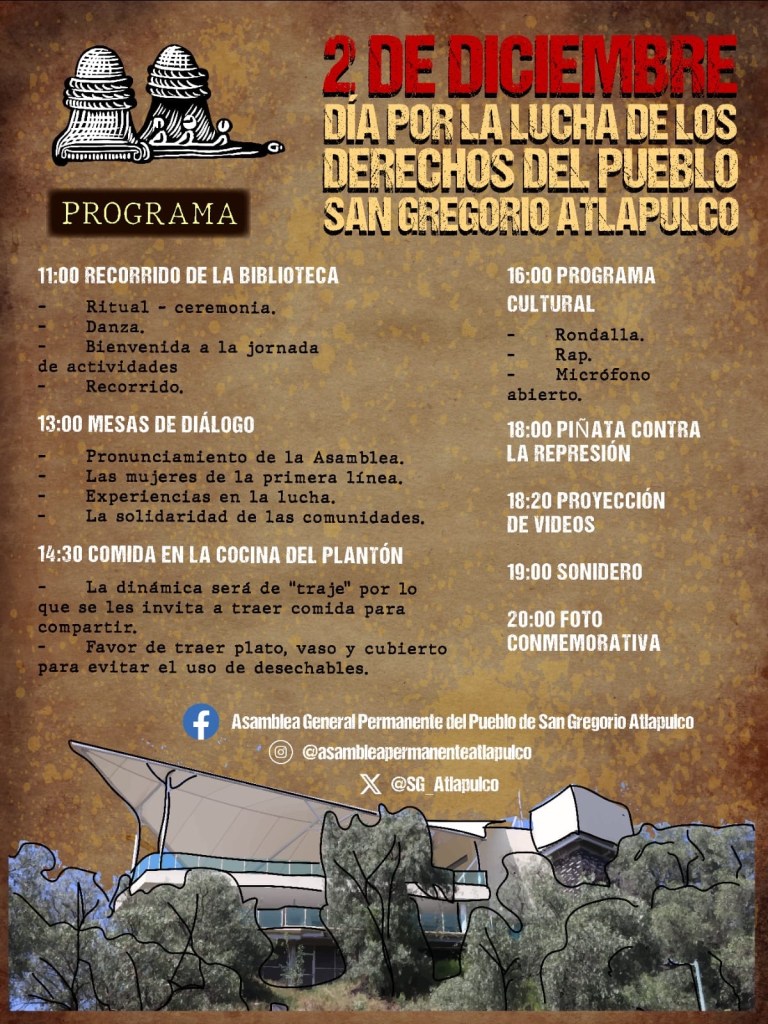 ⭕ A un año de la represión que sufrió nuestro pueblo por un millar de granaderos que encapsularon y agredieron a quienes nos manifestamos por la defensa del agua de Atlapulco y de nuestros derechos como pueblo originario, hacemos un llamado para reivindicar esta fecha en la que el Gobierno intentó silenciarnos mediante la fuerza policial para declarar el Día por la Lucha de los Derechos del Pueblo de San Gregorio Atlapulco este sábado 2 de diciembre de 2023.