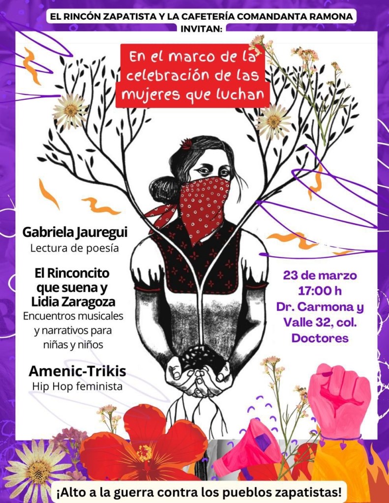 En el marco de la celebración de las mujeres que luchan, 23 de marzo, 5pm, Rincón Zapatista, Carmona y Valle 32