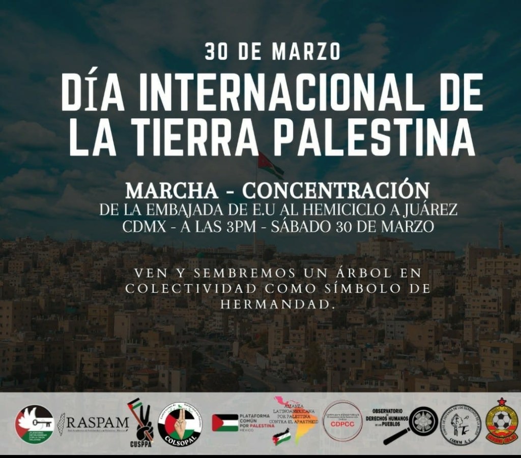 Día Int de la Tierra Palestina, 30 marzo, 3pm frente a Embajada EU hacia el Hemiciclo a Juárez.