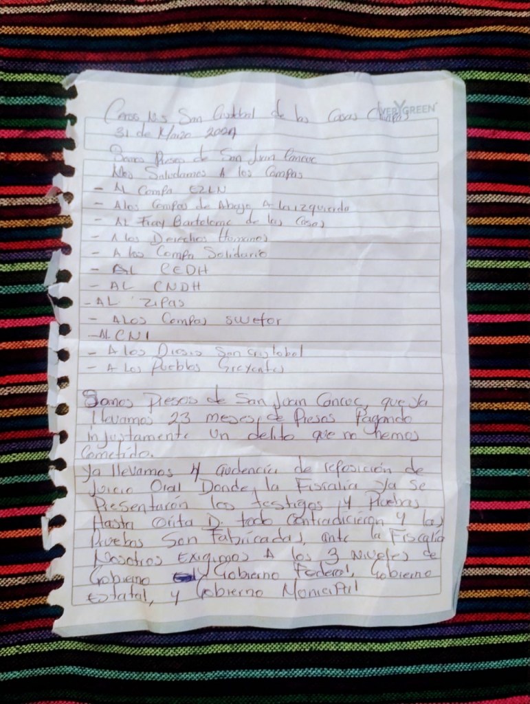 Somos los presos de San Juan Cancuc que ya llevamos 23 meses de presos pagando injustamente un delito que no hemos cometido.