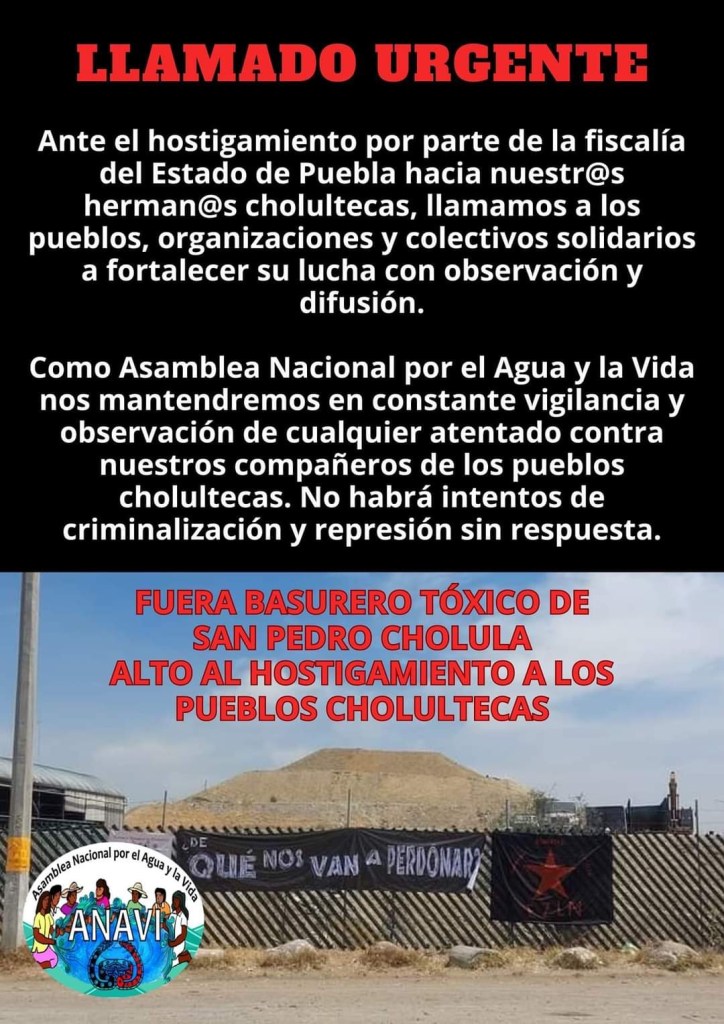 Como Asamblea Nacional por el Agua y la Vida nos mantendremos en constante vigilancia y observación de cualquier atentado contra nuestros compañeros de los pueblos cholultecas. No habrá intentos de criminalización y represión sin respuesta.