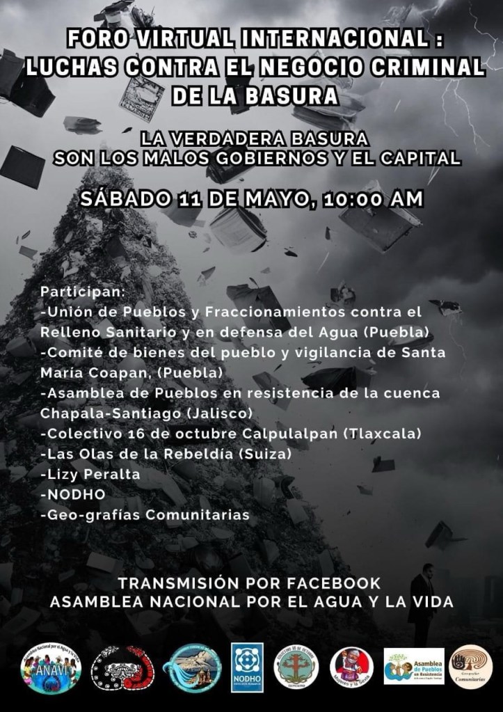 Es por eso que, desde la Asamblea Nacional por el Agua y la Vida, queremos invitar a todos al próximo foro virtual internacional: «Luchas contra el negocio criminal de la basura: la verdadera basura son los malos gobiernos y el capital». Que se llevará a cabo el próximo sábado 11 de mayo de 2024, a las 10:00 horas a través de esta página.