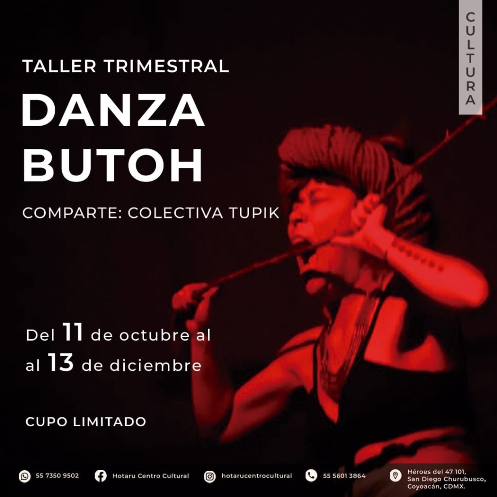 Buen día. Les comparto la invitación para participar en el taller de danza Butoh que impartiremos a partir de este viernes 11 de octubre . En el centro de cultura Hotaru. En Coyoacán. Inscripción en el número que está en el cartel.