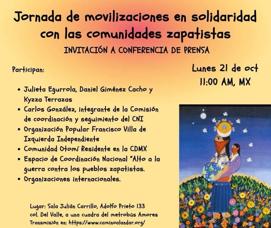 Conferencia de prensa. Jornada de movilizaciones en solidaridad con las Comunidades Zapatistas. Lunes 21 oct, 11am. Adolfo Prieto 133, Col. del Valle.