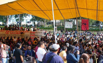 Mientras en las comunidades empieza este proceso de destrucción a partir de la entrada de Salinas de Gortari al gobierno —que significó para nosotros una auténtica guerra de exterminio— , los que empiezan a plantear, las que empiezan a plantear este problema de destrucción de la comunidad son las mujeres. Y es porque han conquistado un lugar en la asamblea para ser tomadas en cuenta en su voz, aunque no todavía en la hora de las decisiones. Porque a la hora de decidir, votaban sólo los hombres, no las mujeres ni los niños.