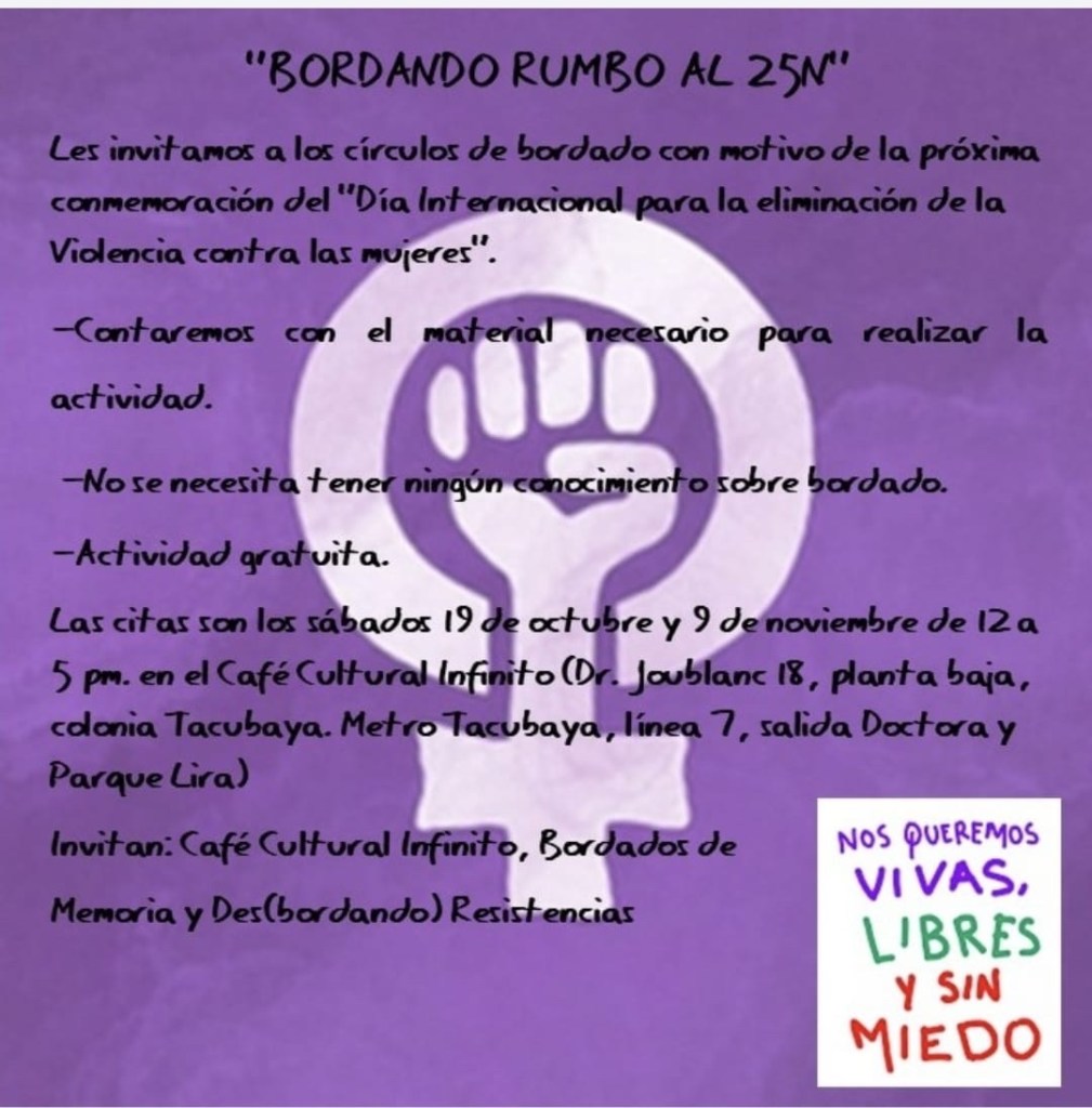 Bordado rumbo al 25N. Sáb 9 nov, 12pm a 5pm. Café Cultural Infinito.
