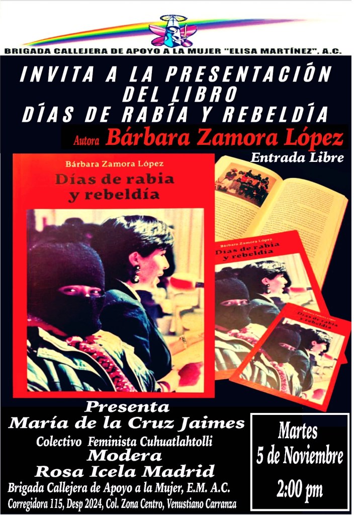Días de Rabia y Rebeldía, presentación del libro de Bárbara Zamora López. Brigada Callejera de Apoyo a la Mujer EM, AC. Martes 5 de Nov, 2pm