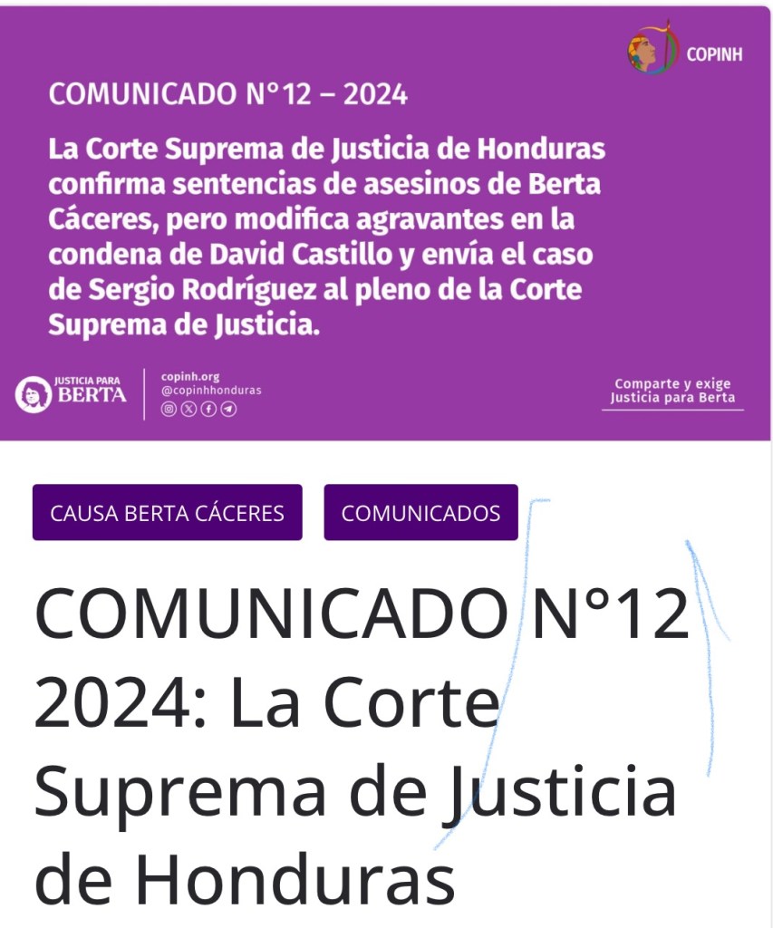 COMUNICADO N°12 2024: La Corte Suprema de Justicia de Honduras confirma sentencias de asesinos de Berta Cáceres, pero modifica agravantes en la condena de David Castillo y envía el caso de Sergio Rodríguez al pleno de la Corte Suprema de Justicia.