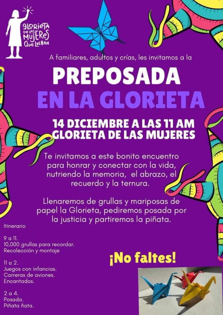Acompáñanos a romper piñatas llenas de deseos, dulces y pensamientos alentadores, a cantar por la justicia y a colocar grullas y mariposas de papel para que se cumplan nuestros deseos, honrando desde la memoria la vida de nuestros familiares, ven a nutrir esta grande lucha entre todxs desde la esperanza, la felicidad y el recuerdo.