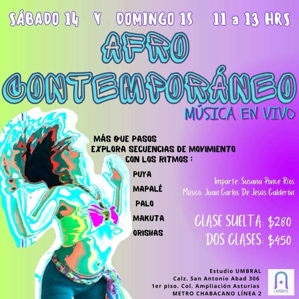 Clase de Afro Contemporáneo. Estudio Umbral. SAN Antonio Abad 306. Sáb 14 y Dom 15. 11 a 13 hrs