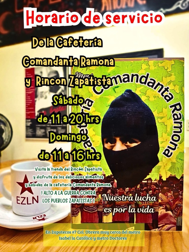 Visita la tienda del Rincón Zapatista y disfruta los deliciosos platillos y bebidas de la Cafetería Comandanta Ramona.