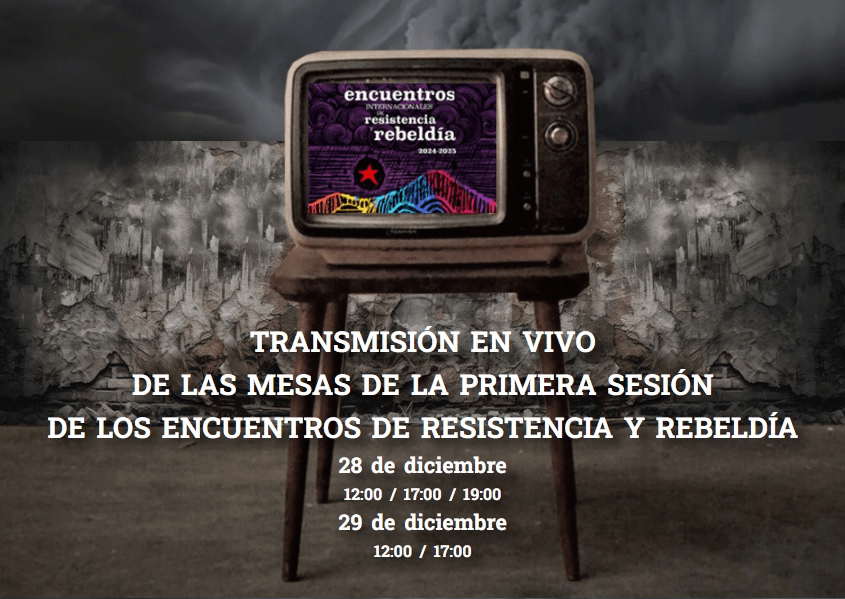 TRANSMISIÓN EN VIVO DE LAS MESAS DE LA PRIMERA SESIÓN DE LOS ENCUENTROS DE RESISTENCIA Y REBELDÍA 28 de diciembre 12:00 / 17:00 / 19:00 29 de …