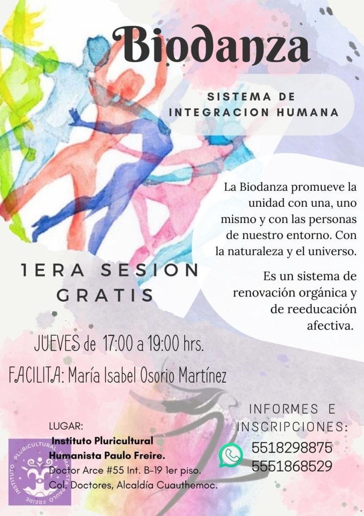 Te invitamos a celebrar la vida, a través del movimiento, la música y el encuentro en grupo. Biodanza, se practica, en grupo, con música, movimiento, contacto y caricias; con ropa comoda y sin zapatos.