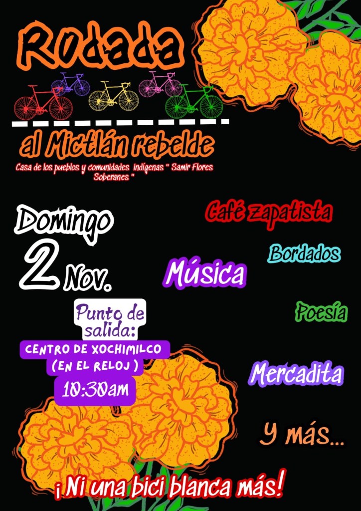 las actividades se llevarán a cabo el día 1 y 2 de noviembre, en casa de los pueblos y comunidades indígenas «Samir flores Soberanes» (av. México-coyoacan 343, col. Xoco, Benito Juárez). la rodada solo será el día domingo 2 de noviembreOtomíes en Resistencia y Rebeldiafbl
