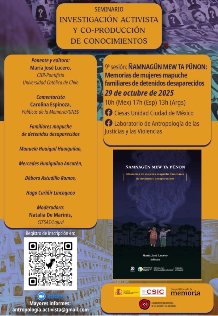 Es un libro maravilloso escrito con familiares de indígenas mapuche desaparecidos en Chile. De los pocos libros que existen sobre la experiencia indígena de desaparición, está en español y mapudungun y fue ilustrado x un artista indígena. Es importante como mexicanos que enfrentamos una crisis de desaparición, voltear la mirada a otras geografías que han pasado lo mismo.