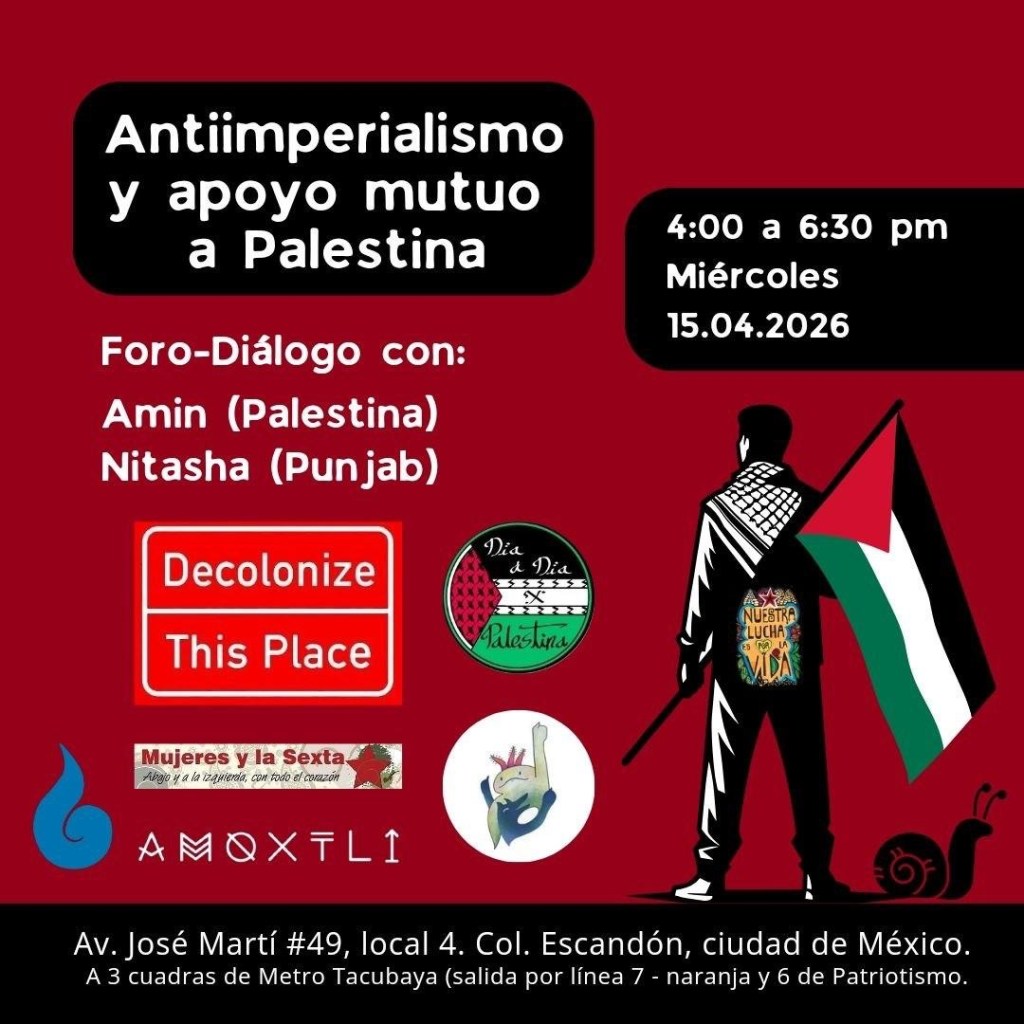 Foro-diálogo: Antiimperialismo y apoyo mutuo a Palestina. Decolonize this place. Miér. 15 abril, 4 a 6:30pm, en Amoxtli