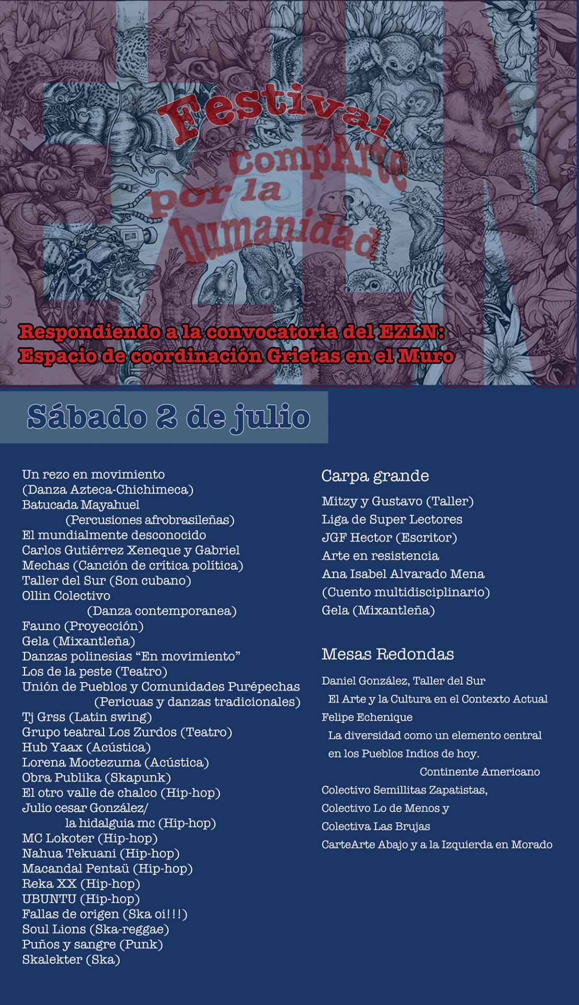 Festival y Compartición CompArte por la Humanidad Sede alterna «Grietas en el Muro». Compañer@s, La Tormenta se encuentra ya sobre nosotr@s y la única forma de resistir y contenerla es agrietando el muro. ¡Hagámosla más profunda! Para nosotr@s, al igual que para el Zapatismo, “artista es todo aquel que reivindique su actividad como arte,Sigue leyendo «CompARTE «Grietas en el Muro» en Explanada de Bellas Artes» domingo 3 de julio.»