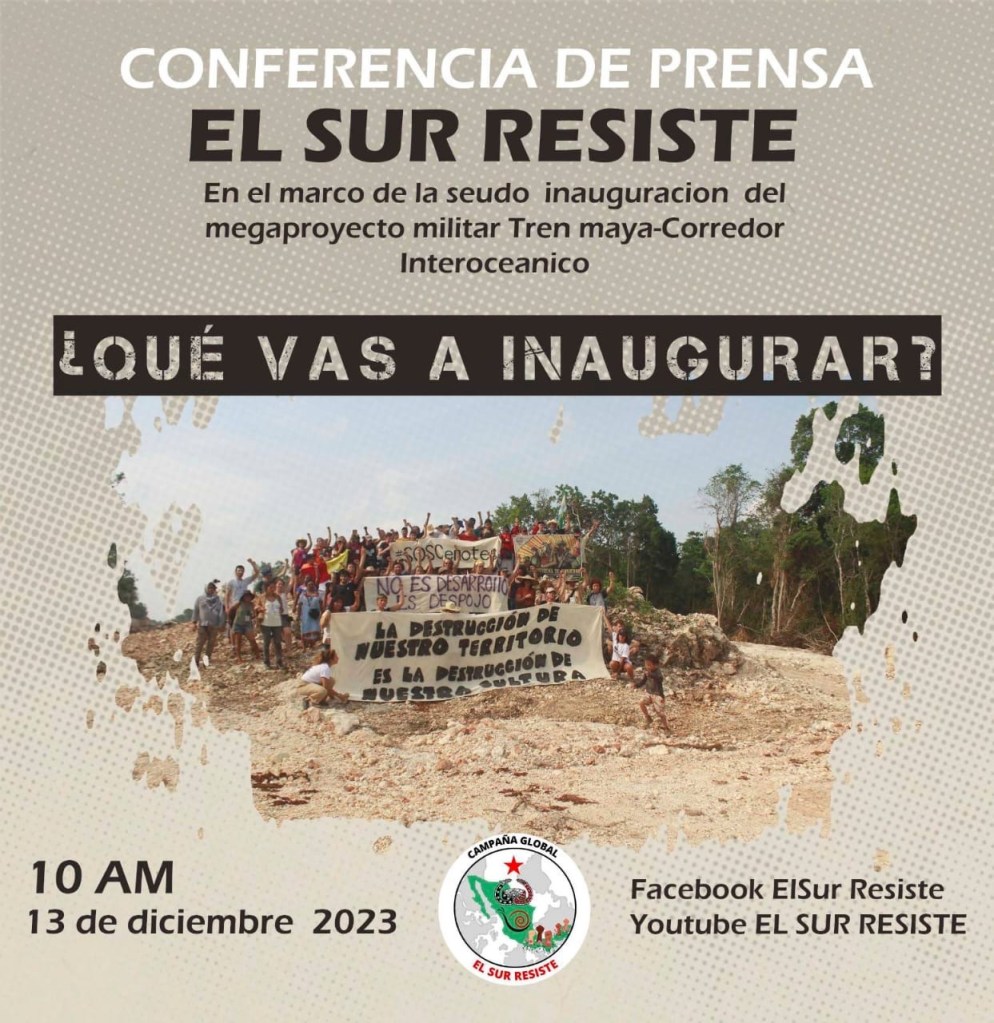 Invitación a Conferencia de prensa El Sur Resiste (virtual) De parte de la campaña global El Sur Resiste invitamos a los medios de comunicación a esta conferencia en el marco de la seudo inauguración del megaproyecto militar maya – Corredor Interoceánico. Los pueblos nos preguntamos ¿Qué vas a Inaugurar? En esta rueda de prensa, las comunidades y resistencias del Sureste Mexicano actualizarán los desastres y militarización que ha dejado de la imposición de estos megaproyectos en nuestros territorios.