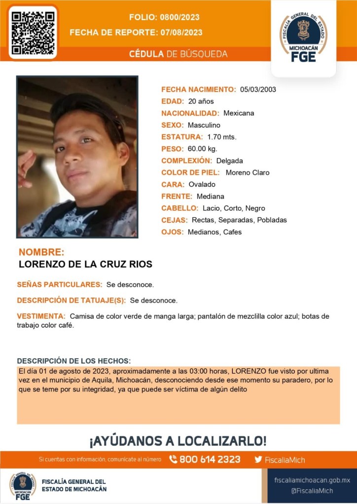 El día 1 de agosto de 2023, 3 habitantes de la comunidad de Santa María Ostula se encontraban en la cabecera municipal de Coalcomán resolviendo asuntos comerciales personales. Dos de ellos en camioneta y otro en su motocicleta. Al salir Lorenzo Froylán de la moto, fue detenido por un retén del llamado Cártel Jalisco Nueva Generación (CJNG).