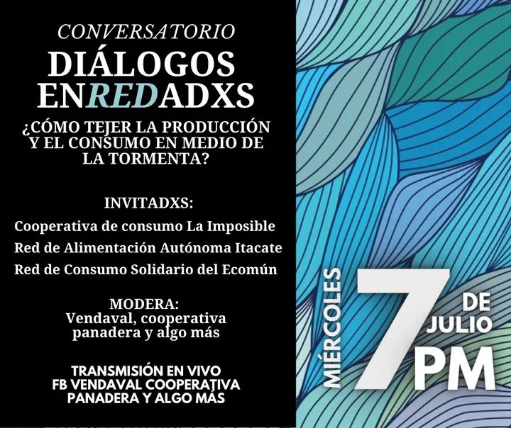 Estamos re contentas porque a las 7 tenemos una cita ¡Uhhhh! Les esperamos para la transmisión de Dialogos enREDadxs, donde estaremos platicando con Cooperativa de Consumo La Imposible, La Red de Alimentación Autónoma Itacate y la Red de Comsumo solidario del Ecomún, de cómo es esto del tejer entre consumo y producción en la ciudad. Para entrarle sabroso a la platicada les proponemos abordar las siguientes preguntas: *¿Qué piensan de la relación consumo-producción? ¿Cómo construir una relación de cercanía y compromiso mutuo? *¿Cómo se sostienen estos proyectos en términos del trabajo? ¿Qué rol juegan los consumidores en ese sostén? *¿Cómo se valora el trabajo que hacen lxs productores poniendo trabajo también desde el consumo? ¿Asumiendo una responsabilidad de proveernos como consumidores? *¿Cómo caminar hacia que la producción esté garantizada? Que dejemos de producir en el vacío para luego ver si logramos vender. *¿Cómo se garantiza también que existan productos que las comunidades necesitan para consumir? ¿Cómo construimos juntxs la posibilidad de que los proyectos productivos alternativos puedan sobrevivir en el tiempo?