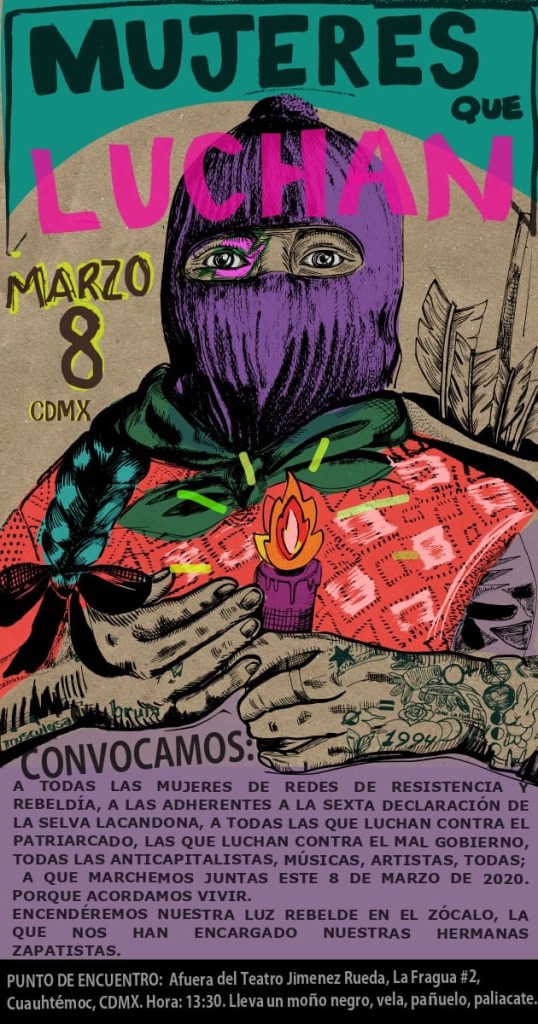 Y en todos esos dimes y diretes que se traen allá arriba los malos gobiernos, los grandes medios de comunicación, los partidos políticos y los cabezas grandes, se olvida lo más importante que va a marcar esos días 8 y 9 de marzo, y que no es que nos están matando como mujeres que somos, sino es que vamos a luchar por nuestra vida con todos los medios y según nuestro modo, tiempo y lugar de cada quien.
